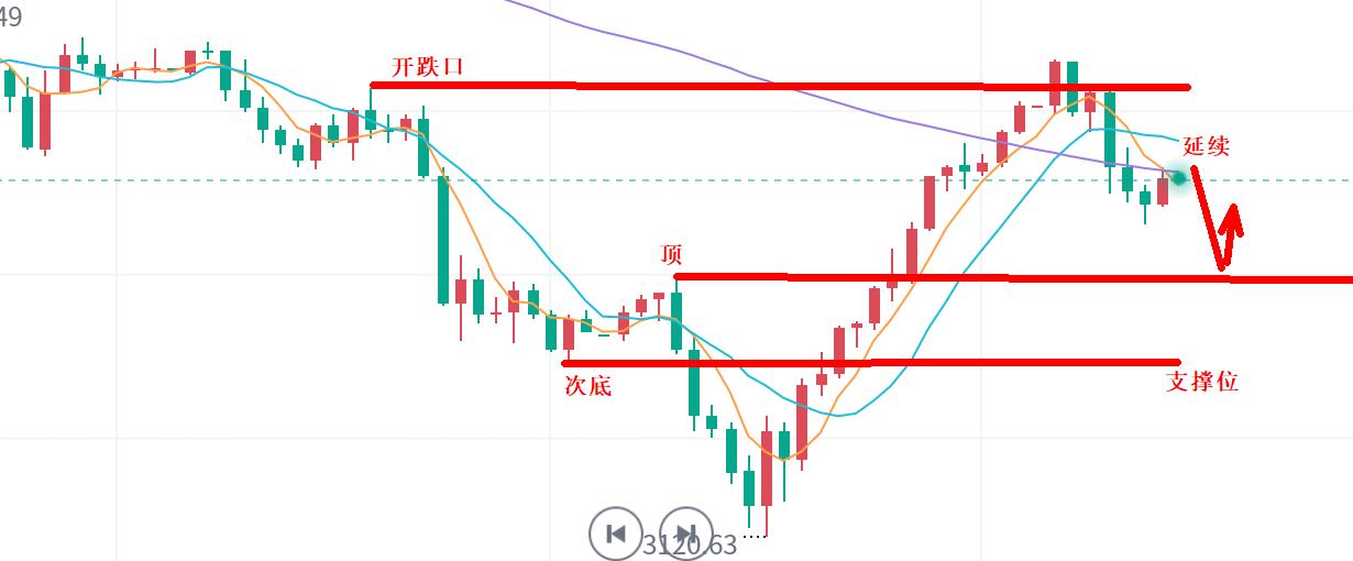 2,回撤沒有觸及3121-3250上升回撤382位置3202一線,微差反彈,第一波上升結束。