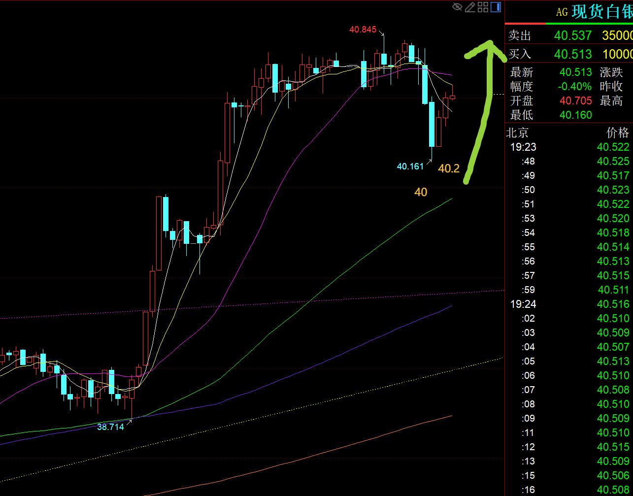 第二,白銀方面:週末視頻提前給出回踩39.5、39.35都可以繼續看漲,昨日一早下探39.5企穩後,一路單邊強攻至40.6一線,一天直接拿下1塊,相當於黃金50美金漲幅;