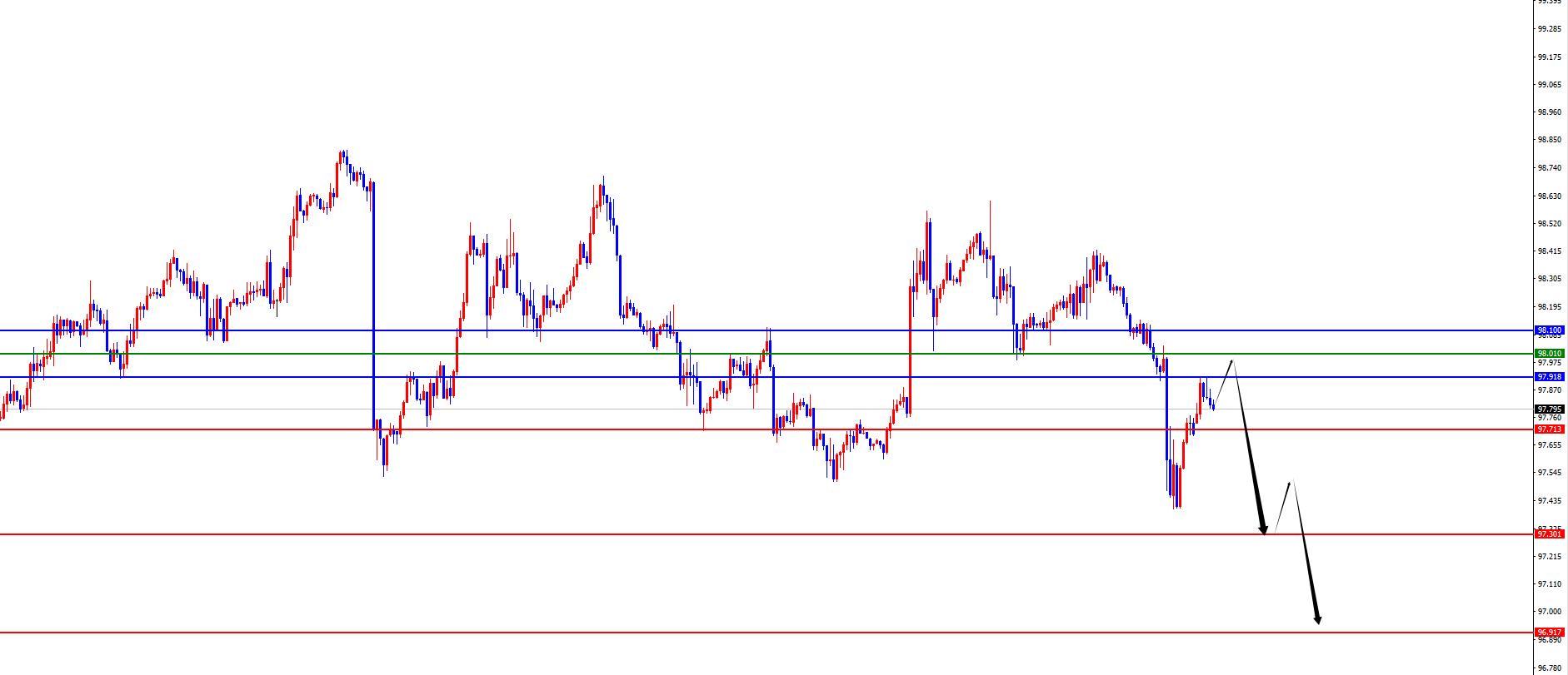 從多周期分析,週線級別來看近期價格在周線關鍵上下盤整,目前週線阻力於97.90區域,價格在此位置之下偏空對待,價格只有後續週線收盤在此位置上方才會轉多。從日線級別看,隨著時間的推移目前日線阻力於98.10區域,價格目前在此位置下方則偏空,近期價格在日線關鍵位置上下盤整,操作上需要關註四小時節奏。從四小時上看目前四小時阻力於98區域,價格在此位置之下偏空對待,在價格沒有突破四小時阻力之前偏空對待,後續如若上破則需要及時掉頭,目前暫時右側交易方式對待即可。
