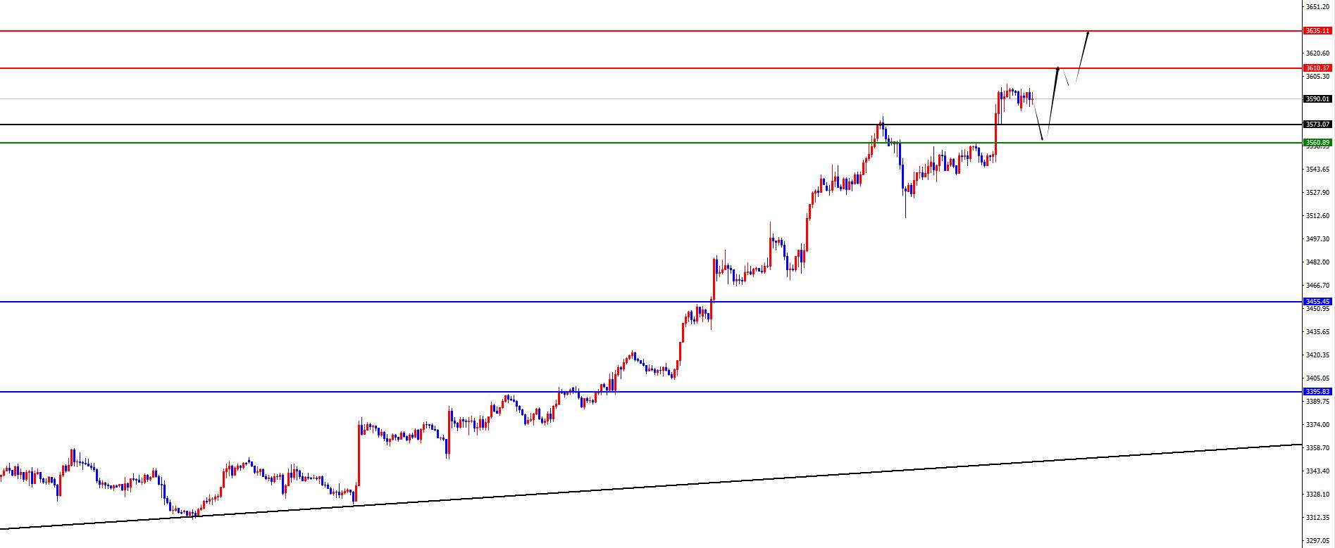 從多周期分析,首先觀察月線節奏,月線上價格8月份大陽收尾,整體看價格依舊多頭運行,從長線上看3000位置是長線走勢的分水嶺,價格在此位置之上長線多對待即可。從周線級別看,價格經過近期持續震盪後突破關鍵阻力,目前持續再創歷史新高位置,目前週線多空分水嶺於3395位置,價格在此位置之上中線多對待即可。從日線級別看,暫時需要關注3455區域支撐,此位置之上波段多對待。從四小時上看,黃金近期持續依托四小時支撐上漲,隨著時間的推移目前四小時支撐於3362區域支撐,後續繼續關注此區域支撐上漲。同時從一小時上看價格目前短線有調整的表現,所以暫時等待價格回撤調整後再佈局,位置上關注3561-3562區間支撐,上方關注3610-3635區域。