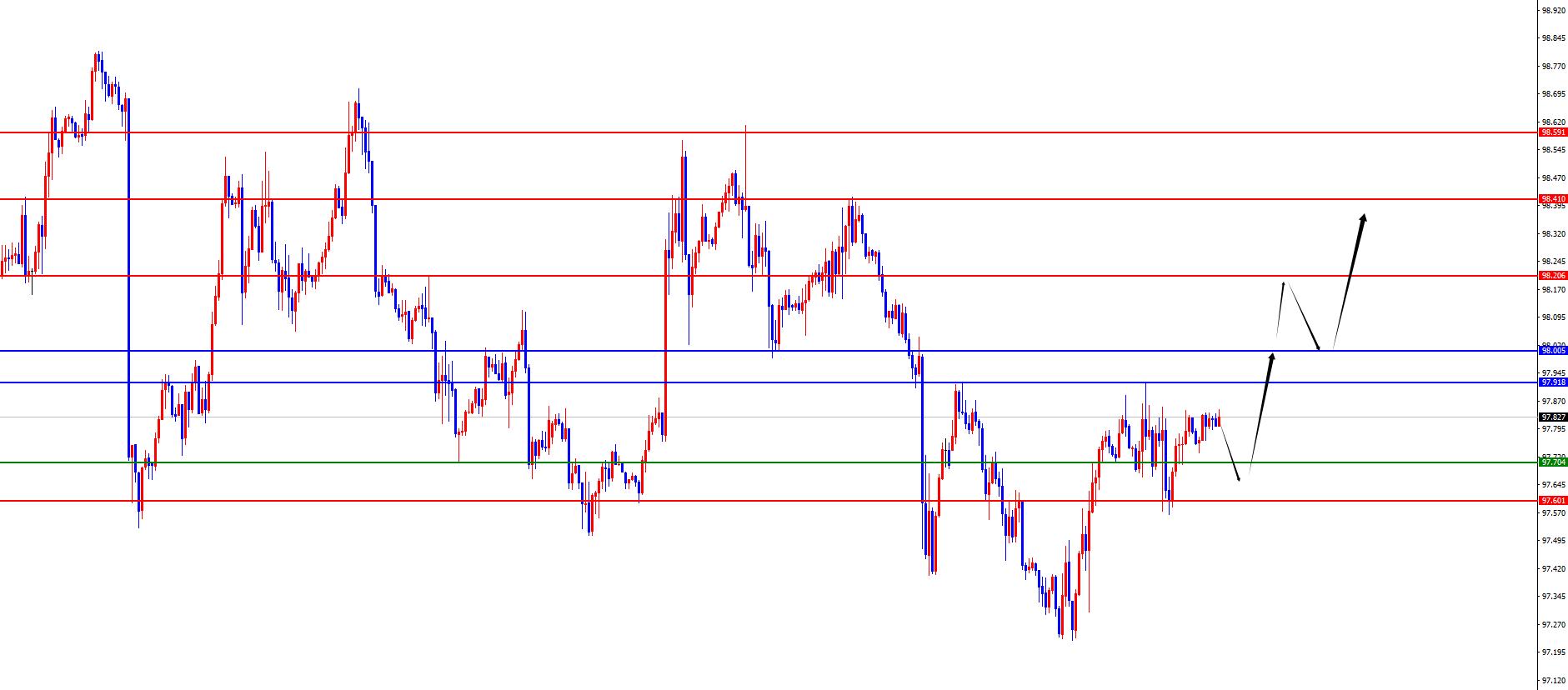 從多周期分析,週線級別來看近期價格在周線關鍵上下盤整,目前週線阻力於97.90區域,價格在此位置之下偏空對待,價格只有後續週線收盤在此位置上方才會轉多。從日線級別看,隨著時間的推移目前日線阻力於98區域,目前需要關注價格能否站穩日線及週線共振阻力是關鍵。從四小時上看,昨日如期回踩四小時支撐後進一步上漲,目前價格依舊在四小時支撐上方,今日重點關注97.60-70區間支撐,上方關注97.90-98區間站穩狀態。一小時上目前短線呈現震盪上漲,所以繼續等待回踩支撐後上行,價格後續站穩關鍵阻力後才會持續發力。