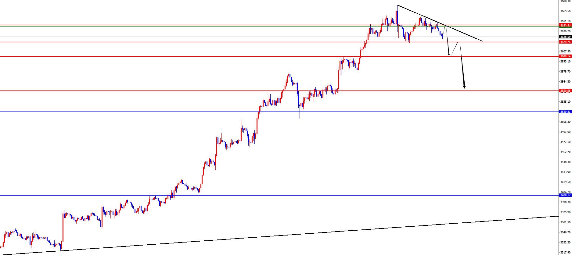 從多周期分析,首先觀察月線節奏,月線上價格8月份大陽收尾,整體看價格依舊多頭運行,從長線上看3000位置是長線走勢的分水嶺,價格在此位置之上長線多對待即可。從周線級別看,價格經過近期持續震盪後突破關鍵阻力,目前持續再創歷史新高位置,目前週線多空分水嶺於3400位置,價格在此位置之上中線多對待即可。從日線級別看,暫時需要關注3518區域支撐,此位置之上波段多對待。從四小時上看,前期價格維持在四小時支撐上方運行,但是昨日跌破此區域,所以目前3644-3645區間成為關鍵阻力,後續關注此位置承壓。一小時上看目前價格延續承壓,後續重點關注3620-3600區域,如若極弱的表現下則關注3550-3520區域。