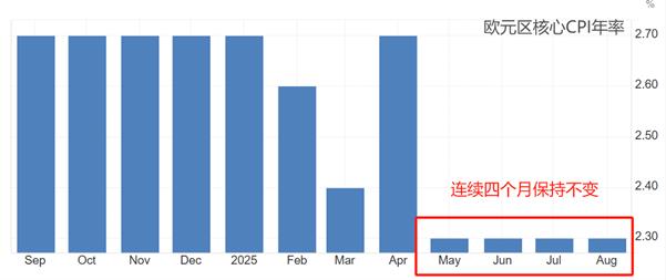 經濟數據角度看,歐元區7月失業率為6.2%,連續兩個月下降。雖然仍高於5%的警戒線水平,但已經達到了歷史上的相對低位,無法改變歐央行維持利率不變的決心。歐元區8月核心CPI年率為2.3%,處於2%溫和通脹附近,且已經連續四個月保持不變,通脹形勢極為穩定。歐央行的兩大任務分別是充分就業和物價穩定,現如今兩個目標均宣告達成,沒有理由繼續調整貨幣政策。