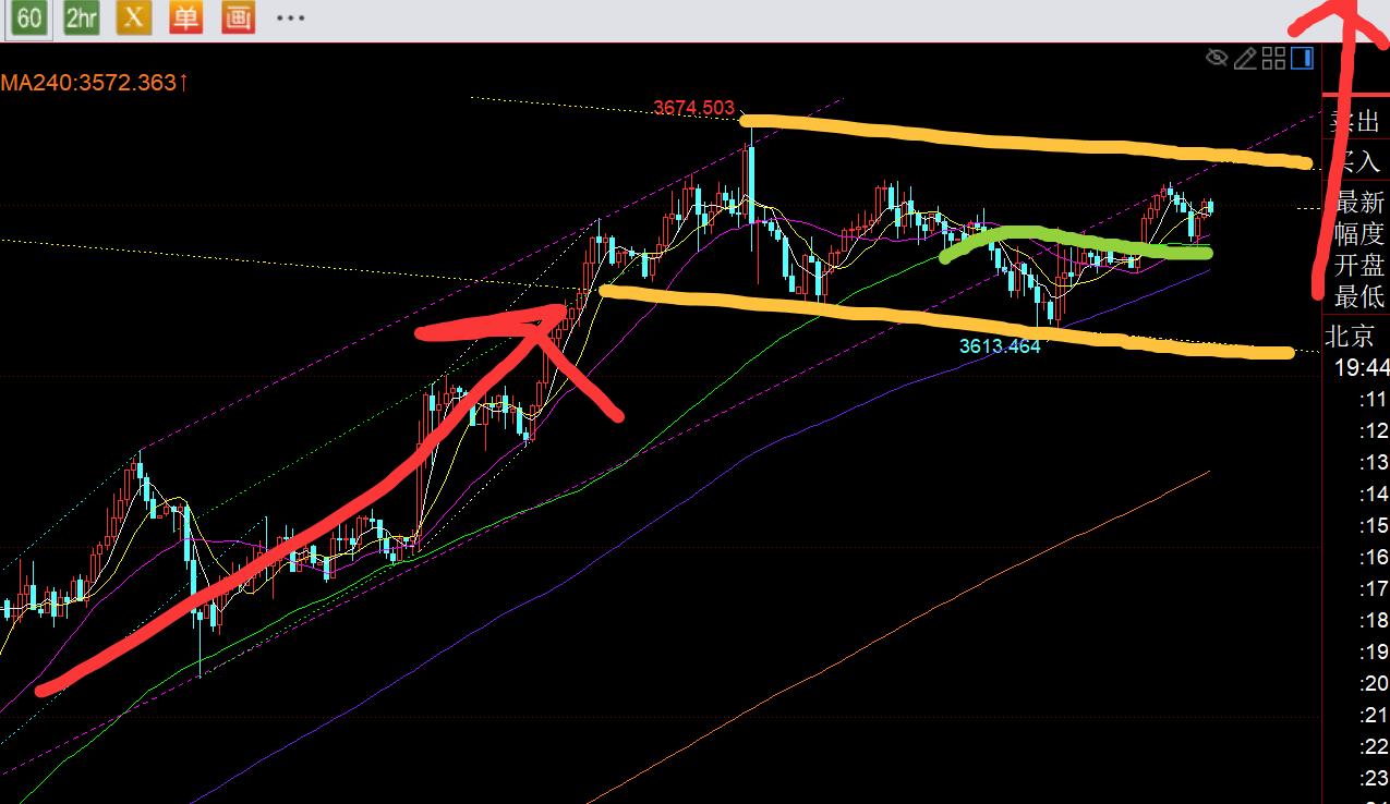 第三,黃金小時線級別:從圖中通道分佈來看,它暫時維持黃色平行通道內,不斷震盪來回整理,走一個上升旗形,最終向上突破發力繼續來單邊;而中軌的得失是決定它能否提前上破的關鍵;若今晚守住中軌,繼續逐步震盪上拉,突破黃色通道上軌的概率就會偏大;若今晚失守中軌,且失守3637歐盤低點,那麼基本是黃色通道內震蕩了,下周初就有可能還會試探通道下軌低位的可能,屆時那個低位也應該會靠攏日線10均線位置,就是一個不錯的低位看漲點,也會是一個小波段機會;今晚就多觀察下,看3637之上能否守住,中軌能否守住,出現探底拉升K了,則再考慮3637之上逢低看漲;失守3637了,今夜就不要急著去看漲,等下週一調整到位至黃色通道下軌;上方阻力是3663-62一線上軌,突破站上它了,才能走上升旗形的單邊拉升概率;