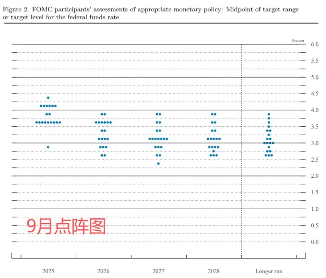 值得注意的是這一次點陣圖顯示,有一位美聯儲官員要求降息50個基點,9月美聯儲降息後應該在年內再降100個基點,而且2026年降息的聲音更強烈。
