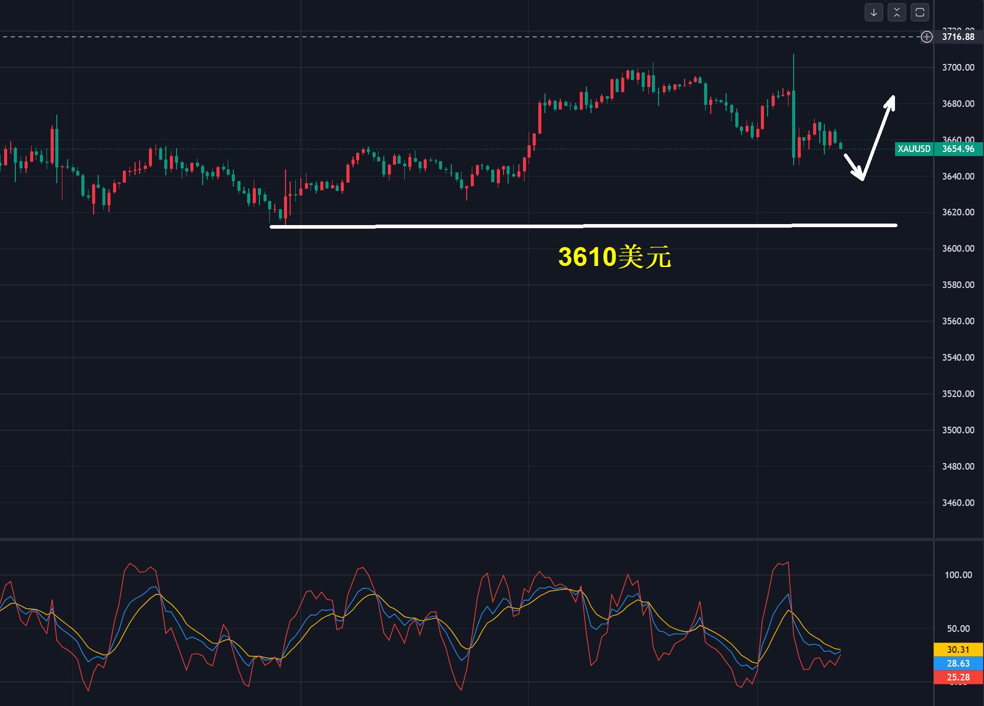 今天,我的觀點是等回落後做多,看多但不追多,關鍵點還是看3610美元的破位,只有破位我才會轉變思路,這並非固執,而是上漲行情的結束一定是看支撐點失守,並非猜測或預判高點。
