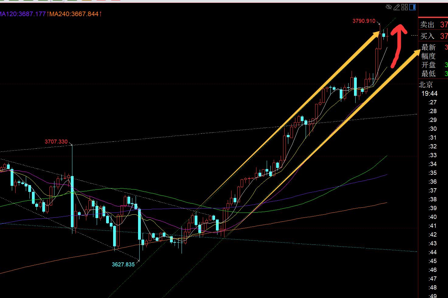 第一,黃金日線級別:昨日繼續收報大陽,符合連陽單邊強勢再次走高,今日目前而言,還是大陽,三連陽的產生,稍微有些加速的跡象,但不是很明顯,因為5均線明日大概率會上移3720一線,就離當前價格其實也不遠,並未達到百米差距;不過,持續連陽逼空走高,是會逐步脫離短期均線,最終會某一天某一刻出現承壓,收報衝高回落K,然後再慢慢震盪下滑去修復,待逐步靠攏短期均線,極限中軌之後,再繼續走單邊上拉;就今日而言,繼續維持看漲,什麼時候出現承壓K,再考慮去走一波震盪修正;