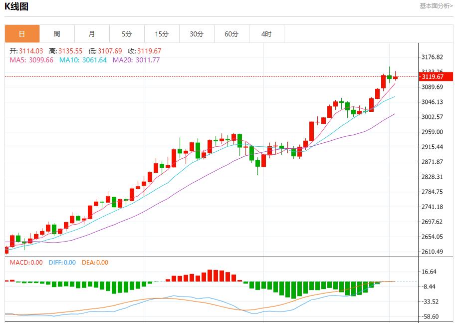 現貨黃金:截止北京時間20:20,現貨黃金上漲,現報3119.43,漲幅0.17%。紐市盤前,金價在盤中水平進行橫盤交易,同時試圖聚集將價格推至新的創紀錄高位的積極勢頭,主要上升趨勢占主導地位,因為價格在短期內沿著次級趨勢線交易,隨機指標在達到超賣水平後發出積極信號。