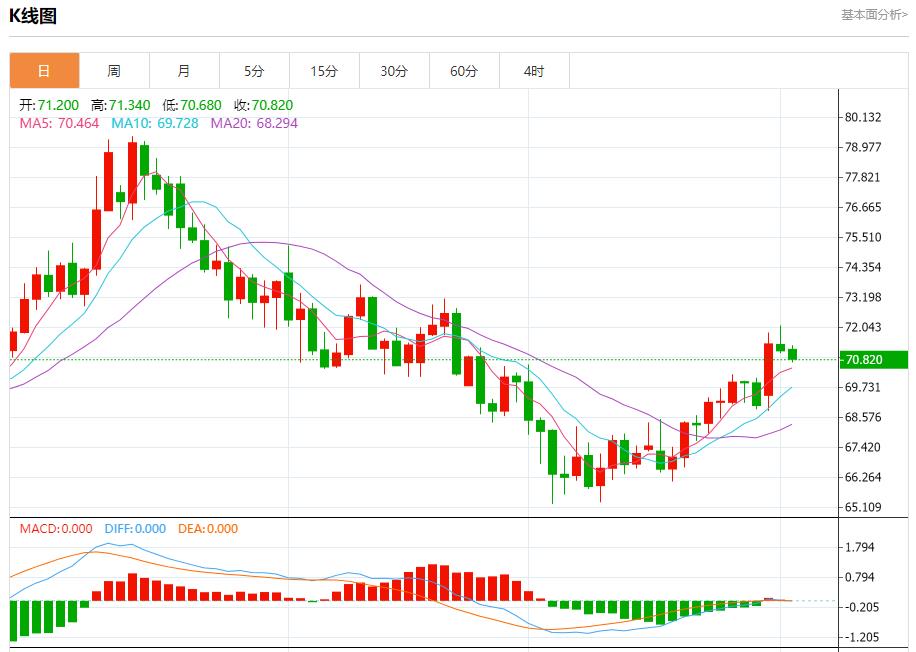 原油市場:截止北京時間20:20,美油下跌,現報70.810,跌幅0.55%。紐市盤前,美國原油價格在最近的盤中交易中從早期的下跌轉為溫和上漲,因為它尋求底部反彈,並幫助它收集必要的積極反彈勢頭,在短期內向上修正趨勢占主導地位,而隨機指標開始形成積極的背離,發出積極的信號。