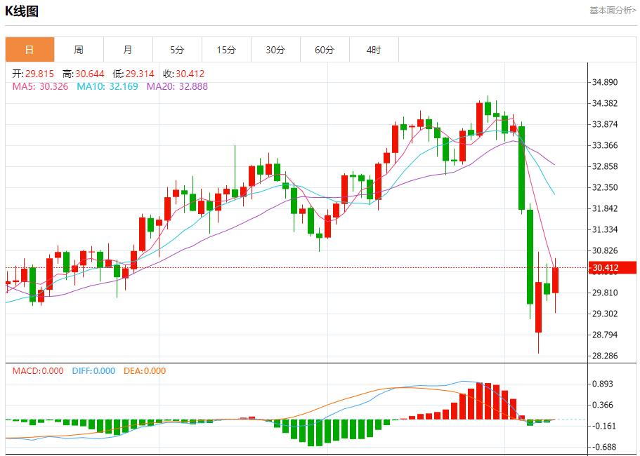 現貨白銀:截止北京時間20:18,現貨白銀上漲,現報30.440,漲幅2.18%。紐市盤前,白銀在最近的交易中在日內水平上漲,在到達高度超賣區域後,相對強度指數(RSI)出現積極信號。這使得價格試圖糾正一些超賣的情況,並收回部分先前的損失。