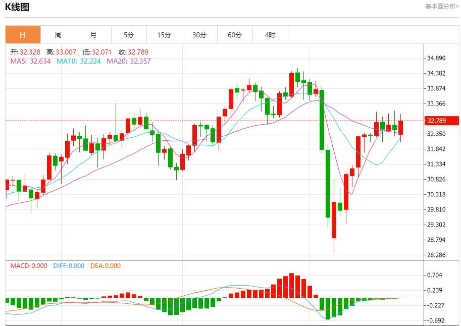 現貨白銀:截止北京時間20:20,現貨白銀上漲,現報32.787,漲幅0.93%。紐市盤前,白銀價格在盤中的最後一個交易中上漲,受EMA50上方交易的支撐,並伴隨著(RSI)上的積極信號,以攻擊32.90美元的頑固關鍵阻力,其中短期看漲修正趨勢占主導地位。