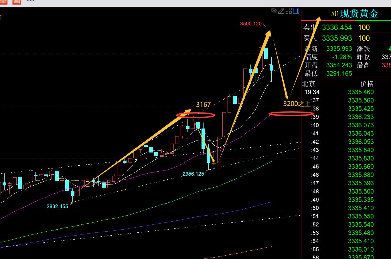 第一,黃金日線級別:昨日收報長上影倒鎚頭陰K線,代表3500暫時短期承壓,今日則看延續下滑;只是一早動靜太大,開盤5分鐘直接從3380掉到3320,日內最低打到了MA10日均線支撐,也剛好是2956-3500回踩的382分割位置3293一線,此位置暫時得到支撐反彈,但是否結束調整,還不能定論,需看日內收線形態來定;從上圖看,若收盤能重新站上MA5日均線阻力3358之上,那麼就有跡象結束下調,下一日必須要配合陽線上拉;反之,收盤於MA5日之下,甚至黃色趨勢線之下,那麼大概率10均線位置還會進行下破的,那麼再往下就是50分割位置3228,正巧是4月16日大陽的起漲點,這裡很有可能是這輪調整的終點,或再往下空間就不大了,因為從標準浪形看,是不能跌破第一浪高點,也就是3167,也是當前中軌處;因此,要么3228逢低企穩,要么3228-3167區域某處企穩,然後最終再回歸多頭趨勢上拉,所以想要炒底的朋友,可以作為一定參考,耐心等待位置;