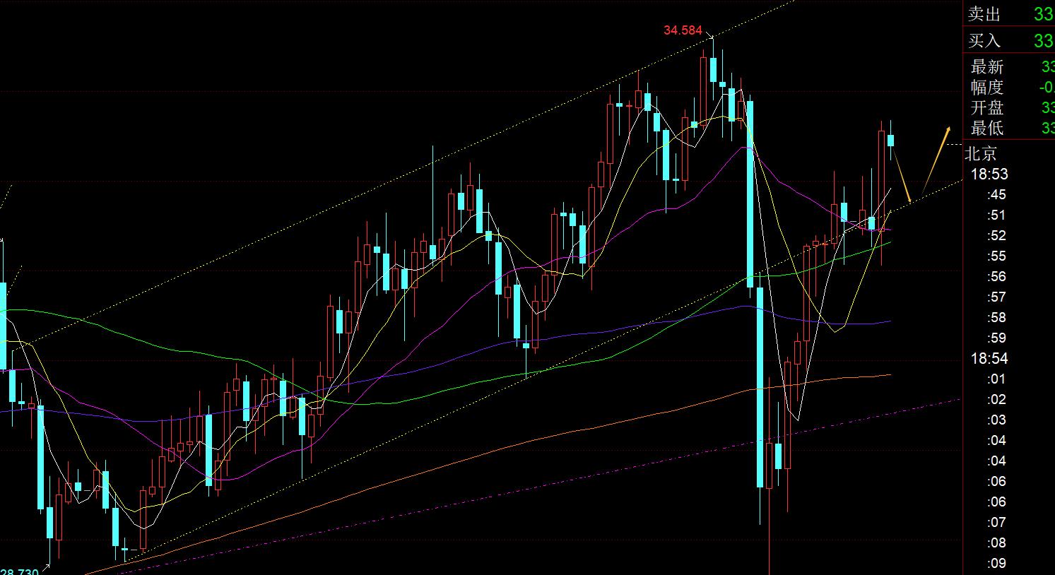 白銀方面:昨日收報大陽,爭奪了幾日,算有效重新回歸前期黃色通道之內,今日回踩33-32.9一線穩定可繼續看漲;
